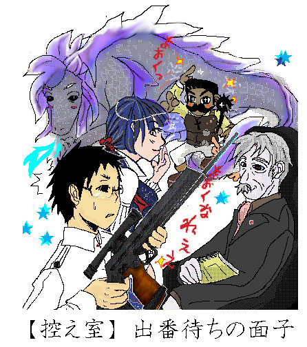 まだ謎のヴェールに包まれた(登場リプレイがまだ無い)PLより、 自分のPC詰め込みありったけ。 上から、 ブルーベル(竜):BBNT ブガン(青が好きな染色ドワーフ):ルナル 東城朔(実はツンデレ、な女の子):DX2 苑内知(ブガンの横にこそっといる男子高校生):DX2 ヤコブ・グリム(椅子に腰掛けたロマンスグレイ):BBNT 岐乃幸也(愛用の銃を青くされた不幸なスナイパー):DX2 どこのリプレイに出てくるかはまだ内緒内緒。